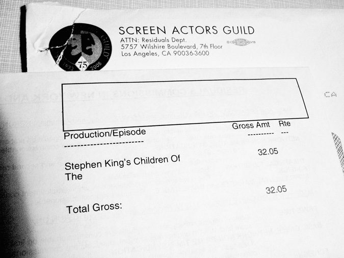 Luckily, I got a residual check in the mail today from the Screen Actors Guild as well.