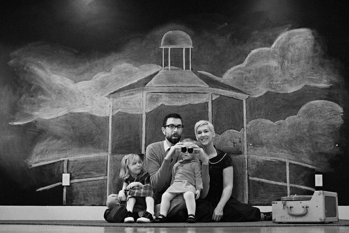 Illustrator and art-director Chad Syme contacted me to do an outdoor shoot of his family on location at a lighthouse. Then things like weather conditions and permits suddenly stopped us in our tracks…. so Chad drew the lighthouse in chalk on a black wall in his house and…